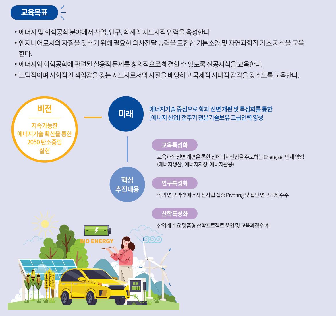 교육 에너지생산, 에너지저장, 에너지활용의 특성화 교육을 통해 신에너지 산업을 주도하는 Energizer 인재 양성 연구 융합연구 프로그램, 캡스톤 디자인등의 연구 프로그램을 통한 전공 핵심역량 배양 산학 산업계 수요 맞춤형 산학프로젝트 운영 및 교육과정 연계